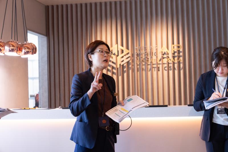 “ クリエイティブな空間でユニークな発想を” をコンセプトに、新しい会場の魅力やこだわりをチームに共有するAP イノゲート大阪マネージャーの橋本美奈子さん