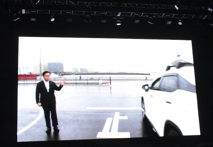 愛知県で結成され世界各国で公演を行う和太鼓パフォーマンスグループ、DRUM TAOの迫力ある演奏に続いて、大村秀明愛知県知事が自動運転車会場入り。