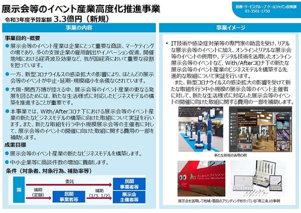 展示会等のイベント産業高度化推進事業(※令和3年度経済産業省予算案)のPR資料(経済産業省のウェブサイトより)
